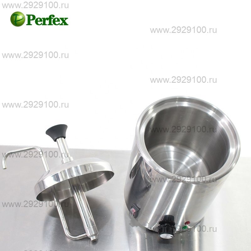 Профессиональный диспенсер-нагреватель Perfex CW-1SL — идеальное решение для подачи горячего сырного соуса, шоколада или других топпингов. Гарантирует идеальную консистенцию и температуру для ваших блюд. Основные преимущества: * Идеален для сырного соуса: Поддерживает сыр и соусы горячими и жидкими, чтобы они идеально сочетались с начос, картофелем фри и другими закусками. * Универсальность: Может использоваться как мармит для подогрева шоколада, карамели и других соусов. * Удобное дозирование: Насосный механизм позволяет порционно и аккуратно подавать соус, экономя время и порции. * Функция подогрева носика: Предотвращает застывание соуса на выходе, обеспечивая постоянную готовность к работе. * Прочная конструкция: Выполнен из нержавеющей стали для долговечной работы в условиях заведения. * Объем: 2,3 л Характеристики Диспенсер для шоколада и сыра Perfex