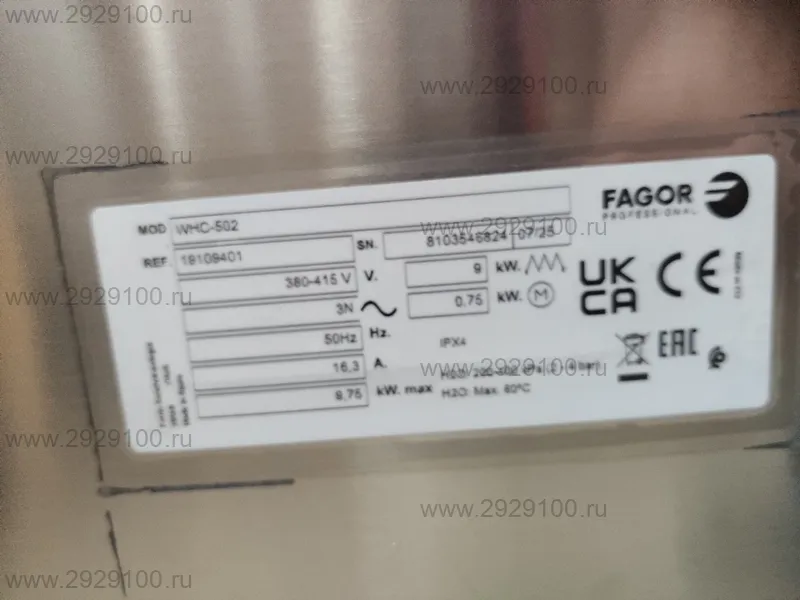 Описание Машина посудомоечная FAGOR WHC-502 D купольнаяУцененный товар Купольная посудомоечная машина для быстрой поточной мойки тарелок, стаканов и мелкой посуды при высокой загрузке. - Производительность: до 40 кассет/ч - Размер кассеты: 500×500 мм - Количество циклов: 4, 90–480 сек - Расход воды за цикл: 2,2 л - Температура мойки / ополаскивания: 60 / 85 °C - Объём бойлера: 9 л - Подключение: горячая и холодная вода - Управление: электромеханическое, встроенные дозаторы моющего и ополаскивающего средств - Комплектация: корзина для стаканов, корзина для тарелок, корзина для столовых приборов Страна производства: Испания Характеристики Машина посудомоечная FAGOR WHC-502 D купольная