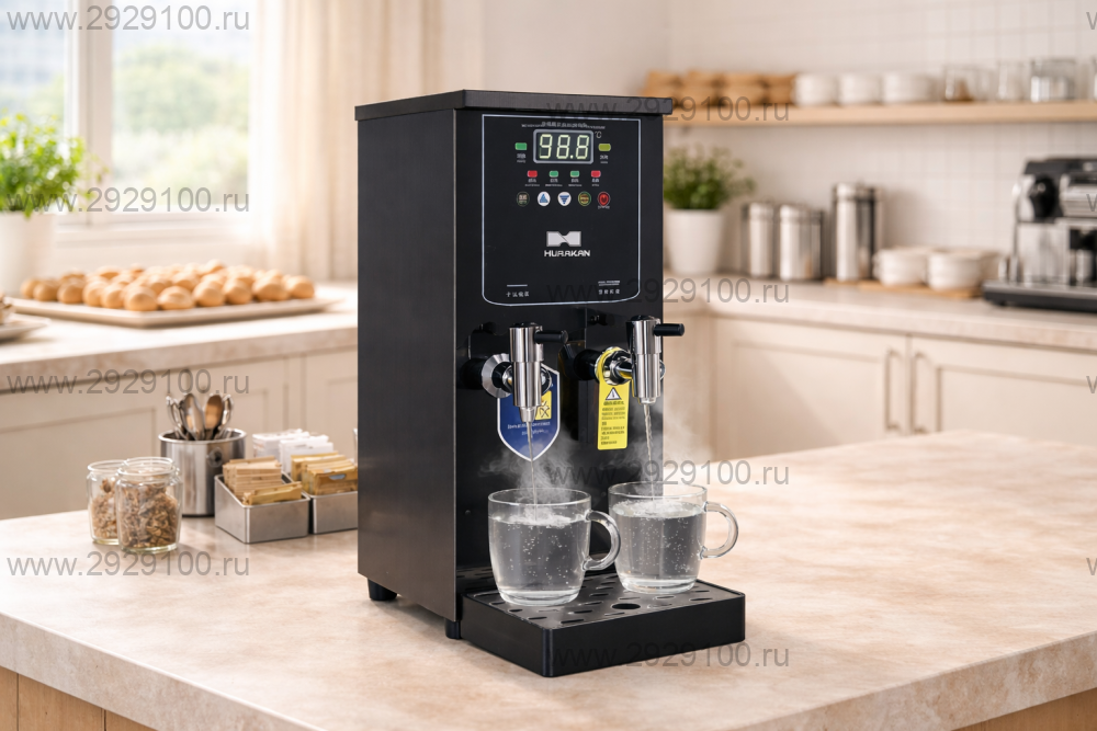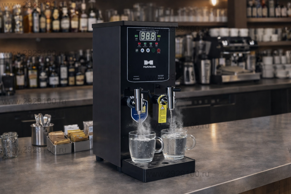 Описание Кипятильник Hurakan HKN-HVZ22DУценка Проточно-накопительный электрический кипятильник, хорошо подходит для стабильного получения горячей воды с моментальной подачей и поддержанием температуры при переменной нагрузке. - Тип: проточно-накопительный кипятильник - Производительность: 22 л/ч - Накопительный объём: 6 л - Подключение: к водопроводу, давление 0,2–0,6 МПа - Управление: электронная панель - Контроль и безопасность: автоматический контроль уровня и температуры воды, блокировка работы без воды, защита от перегрева, индикация ошибок - Оснащение: 2 сливных крана, каплесборник, индикатор нагрева - Материал корпуса: нержавеющая сталь - Цвет исполнения: чёрный - Страна производства: Китай В ресторанном бизнесе бойлером называется аппарат для кипячения и подогрева воды для чая. К сожалению, очень часто рестораторы экономят на приобретении этих аппаратов и используют для приготовления чая горячую воду из бойлера кофемашины.