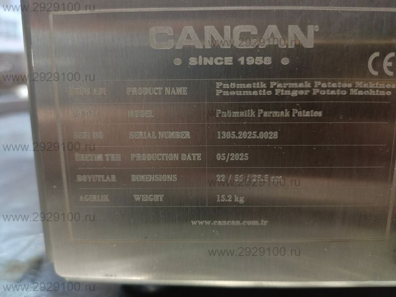Пневматическое устройство для нарезки картофеля, хорошо подходит для быстрой и равномерной подготовки брусков при высокой загрузке и стабильном результате. - Тип: пневматическое устройство для нарезки картофеля - Формат нарезки: брусок 10×10 мм - Максимальный диаметр клубня: до 8 см - Привод: пневматический - Рабочее давление: 6–8 бар - Максимальная сила: до 1500 Н - Материал корпуса и лезвий: пищевая нержавеющая сталь - Оснащение: патрубок для подключения воздуха, ножки-присоски для устойчивости - Обслуживание: быстрая разборка для санитарной очистки - Страна производства: Турция Характеристики Устройство для нарезки картофеля Cancan 1305-2