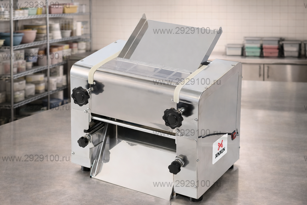 Описание Тестораскатка-лапшерезка XINXIN DHH-300RTЭлектрическая тестораскатка с функцией лапшерезки для раскатки теста в пласты и автоматической нарезки на полосы. - Тип: традиционная тестораскатка - Установка: настольная - Производительность: 20–22,5 кг/ч - Ширина раскатки: 300 мм - Толщина раскатки: от 1 до 20 мм - Лапшерезка: да - Ширина нарезки: 2 мм - Управление: электромеханическое - Материал корпуса: нержавеющая сталь - Ролики и нож: металл с защитным покрытием - Комплектация: нож - Рекомендуемая непрерывная работа: 20–30 минут Страна производства: Китай Характеристики Тестораскатка-лапшерезка XINXIN DHH-300RT