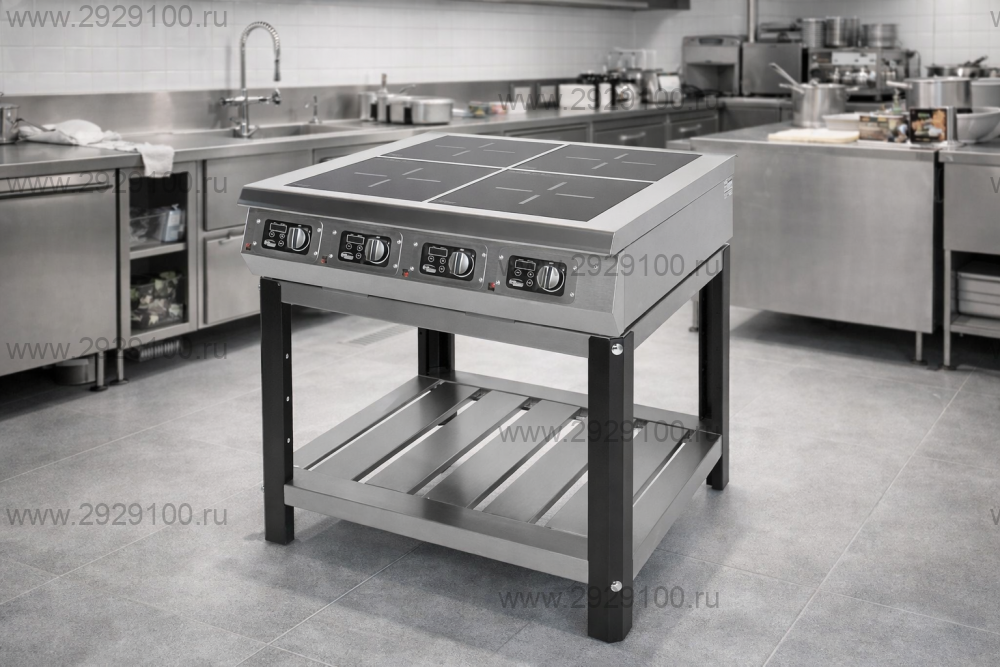 Описание Плита индукционная Grill Master Ф4ИП/800Индукционная плита напольного исполнения с подставкой для одновременного приготовления на четырёх независимых зонах нагрева. - Количество зон нагрева: 4 - Тип зон нагрева: индукционные - Размер конфорок: 300×300 мм - Минимальный диаметр дна посуды: 100 мм - Управление: сенсорное с ЖК-дисплеями и дополнительными механическими переключателями - Регулировка мощности: плавная - Таймер: индивидуальный для каждой конфорки, до 24 часов - Конструкция: открытая подставка с нейтральной полкой - Материал рабочей поверхности: стеклокерамика - Исполнение корпуса и подставки: нержавеющая сталь Страна производства: Россия Характеристики Плита индукционная Grill Master Ф4ИП/800