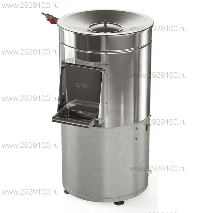 Конструкция бункера очистки овощей изготовлена из нержавеющей стали, каркас-основание – из стали, покрашенной порошковой краской. Единовременное количество загружаемых в рабочий цилиндр продуктов составляет 10 кг, а общая производительность – не менее 300 кг в час. Загрузка корнеплодов осуществляется через удобную воронку, расположенную в верхней части аппарата. Выгрузка очищенных продуктов осуществляется путем открытия двери, при этом не останавливая вращения машины. Конструкция картофелечистки предусматривает установку емкости для сбора шелухи, тем самым предотвращая ее попадание в канализационную магистраль. Конструкция картофелечистки Тайфун Atesy сварная, рабочий цилиндр изготовлен из нержавеющей стали. Единовременное количество загружаемых в рабочий цилиндр продуктов составляет 10 кг, а общая производительность не менее 300 кг в час. Загрузка корнеплодов осуществляется через удобную воронку, расположенную в верхней части аппарата. Выгрузка очищенных продуктов осуществляется путем открытия двери, при этом не останавливая вращения машины. Конструкция картофелечистки предусматривает установку емкости для сбора шелухи. Загрузочный бункер, крышка и загрузочное отверстие выполнены из нержавеющей стали, что обеспечивает долговечность и простоту санитарной обработки. Прочная и надежная нержавеющая ручка разгрузочного люка обеспечивает быстрое открывание и закрывание с надежной фиксацией. Уплотнитель разгрузочного люка обеспечивает его герметичность в процессе работы. Резиновый уплотнитель загрузочного бункера предотвращает травматизм персонала. Специальные резиновые виброопоры предотвращают перемещение картофелечистки во время работы. Специальная подвеска двигателя значительно уменьшает вибрацию во время работы. Штуцер подачи воды имеет кран для регулировки напора воды во время работы. При загрузке картофеля массой до 10 кг не падает скорость вращения и сохраняется высокая степень очистки продукта; Нижний вращающийся диск из корунда, имеющий специальный рельеф поверхности, обеспечивает деликатную и быструю чистку картофеля. Трапециевидный отбойник из корунда обеспечивает дополнительное вращение продукта, что приводит к повышению качества чистки. Подача воды во время работы повышает эффективность очистки и способствует удалению кожуры из рабочей камеры.