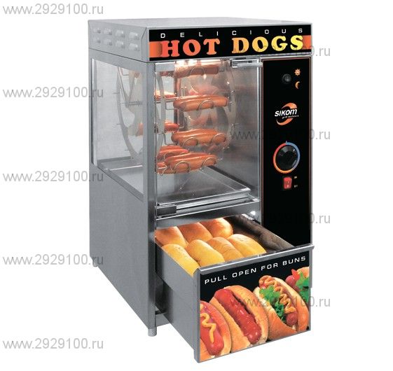 Описание Карусельный гриль МК-1.22Карусельный гриль МК-1.22 — аппарат для приготовления хот догов. Он позволяет одновременно поджаривать 22 сосиски (сардельки) и подогревать булочки для них. Профессиональный гриль МК-1.22 выполнен в виде шкафа, внутренний объем которого разделен на две зоны: нижнюю, с выдвижным ящиком для булочек, и верхнюю, для приготовления и подогрева сосисок. Внутри верхнего отделения, имеющего две стеклянные стенки и стеклянную дверцу, расположен съемный вертел с "люльками". Садки вращаются вокруг собственной оси, когда крутится барабан гриля. Во время одного оборота барабана, каждая сосиска оборачивается дважды и не подгорает. Гриль МК-1.22 оборудован приводом вращения вертела с автоматической системой тормоза, что предотвращает его самопроизвольное вращение при загрузке/выгрузке продуктов. Профессиональный гриль МК-1.22 имеет функцию плавной регулировки температуры. С ее помощью мощный ТЭН нагревает камеру и равномерно обжаривает сосиски со всех сторон. После разогрева продукты остаются теплыми еще в течение долгого времени, не теряя влагу, и не подгорая. Гриль готовит хот дог следующим образом. Продукты, размещенные на вертеле верхнего отделения, поджариваются под действием инфракрасного излучения. А подогрев булочек в нижнем отсеке обеспечивает горячий воздух от двух ламп накаливания, которые работают при включении подсветки. Чтобы приготовить хот дог, достаточно вынуть готовую сосиску из барабана, вложить ее в теплую булочку, и заправить сверху майонезом, кетчупом, горчицей или другим продуктом по желанию клиента.
