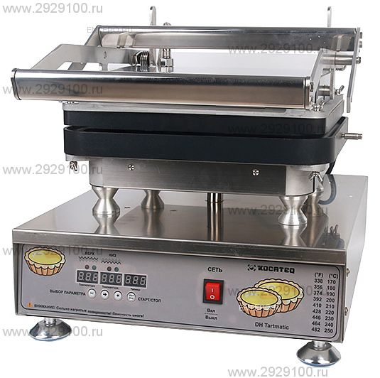 Таймер с акустическим сигналом по окончанию времени выпечки. Раздельные термопары для контроля температуры на верхней и нижней пластинах. Корпус из нержавеющей стали AISI304. Одновременный нагрев верхней и нижней пластин для выпечки до 3 минут. Фиксирование верхней пластины в нижнем положении для получения одинаковой толщины готового продукта. Сбалансированная верхняя пластина. Размеры со сомкнутой верхней пластиной: 440x520x420 мм, размеры с открытой верхней пластиной, макс: 440x520x820 мм. Большой выбор из 39 сменных пластин с антипригарным покрытием из теплопроводящего сплава. Пластины в комплекте не поставляются. Одна пресс-форма - 68000р. Простая смена форм без использования инструмента. Регулируемые по высоте ножки с пластиковыми пятками. Характеристики Тарталетница Kocateq DHTartmatic