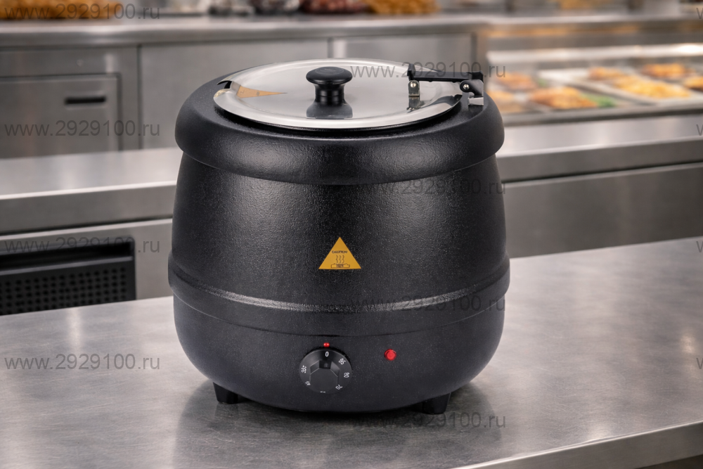Описание Мармит супница Gastrorag SB-6000Настольный электрический мармит для разогрева и поддержания температуры супов, соусов и других жидких блюд. Используется на линиях раздачи в столовых, кафе и ресторанах для постоянного удержания блюд в горячем состоянии без кипячения и подгорания. - Назначение: поддержание температуры супов, соусов и жидких блюд на линии раздачи - Тип установки: настольный, не требует встраивания - Объём ёмкости: 10 л — подходит для среднего потока гостей - Температурный диапазон: 35–95 °C — позволяет работать с разными типами блюд без перегрева - Нагрев: электрический, стабильный и безопасный для непрерывной работы - Регулировка температуры: механический термостат (шкала 0–12) - Внутренняя ёмкость: съёмная, из нержавеющей стали — удобно мыть и наполнять - Крышка: откидная, съёмная, с фланцем — снижает теплопотери при раздаче - Корпус: эмалированная сталь — устойчива к нагреву и ежедневной эксплуатации - Заполнение водой: ручное - Цвет корпуса: чёрный Характеристики Мармит супница Gastrorag SB-6000