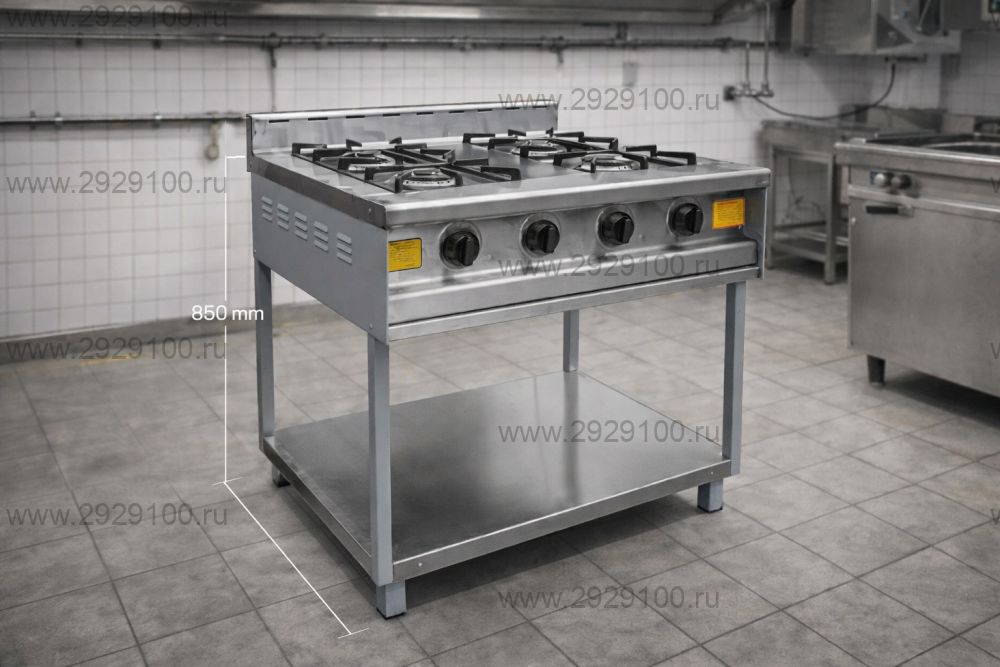 Профессиональная четырёхконфорочная газовая плита для интенсивной тепловой обработки блюд на предприятиях общественного питания. Подходит для автономного использования или встраивания в технологическую линию горячего цеха.