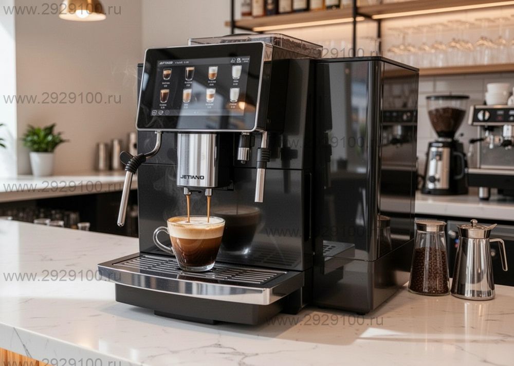 Описание Кофемашина Jetinno JL15 VIVA-BT-MWСуперавтоматическая профессиональная кофемашина с сенсорным управлением, двойной тепловой системой и автоматическим капучинатором для кофеен, офисов и торговых точек. - Тип: суперавтоматическая кофемашина - Производительность: до 120 чашек в час (включая молочные напитки) - Тип кофе: зерновой, с помолом свежего кофе - Дисплей: 7" емкостный сенсорный экран с выбором напитков в одно нажатие и отображением медиаконтента в режиме ожидания - Кофемолка: плоские стальные жернова Ø64 мм, ресурс до 65 000 циклов, 9 степеней помола - Кофегруппа: запатентованная, металлическая заварочная камера до 14 г, предсмачивание и индивидуальная настройка дозировки - Нагрев: два независимых проточных бойлера (вода и пар) - Капучинатор: автоматический, регулировка плотности молочной пены, стабильная температура 60–65 °C - Система водоснабжения: встроенный бак 8 л - Контейнер зерна: с плотной крышкой; каплесборник съёмный, выдвижной - Высота раздаточной группы: регулируемая, от 80 до 160 мм - Система очистки: автоматическая промывка при включении и выключении, ежедневная глубокая очистка молочного контура - Интерфейсы: USB, опционально Wi-Fi и 4G Страна производства: Китай Характеристики Кофемашина Jetinno JL15 VIVA-BT-MW