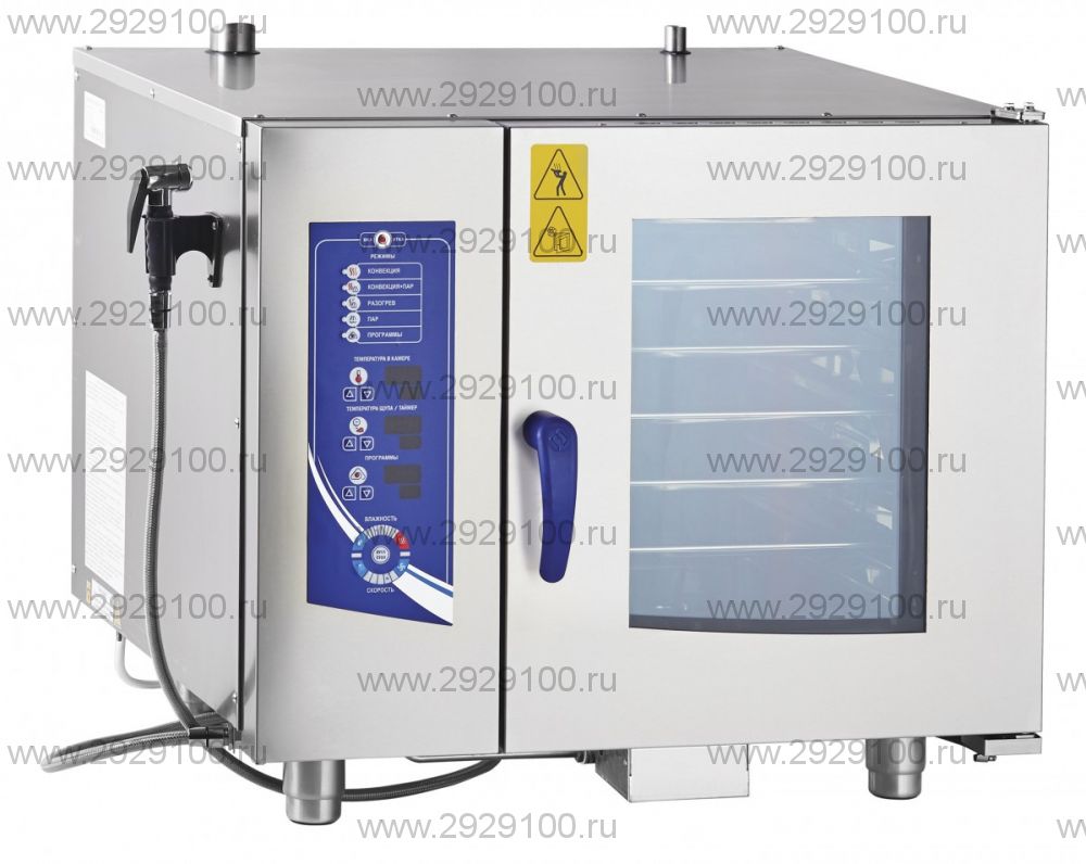 Меню на русском языке. Вентилируемая дверь духовки устраняет риск получения ожога при соприкосновении с внешней стороной дверки. Новый механизм замка «свободные руки» позволит легким движением руки закрыть дверку духовки, а двухходовой механизм открывания обеспечит безопасность персонала от воздействия горячего пара. Дополнительно аппарат оснащен душирующим устройством, а конструкция духовки очень удобна в эксплуатации и уходе. Ее можно мыть изнутри под струей воды, без дополнительных инструментов Вы можете снять жировой фильтр, а ТЭНы легко очищаются от накипи. Все детали пароконвектомата изготовлены из нержавеющей стали. Максимальная температура шкафа: 270 °С Характеристики Пароконвектомат ПКА 6-1/1ВМ2-01 (автоматическая мойка)