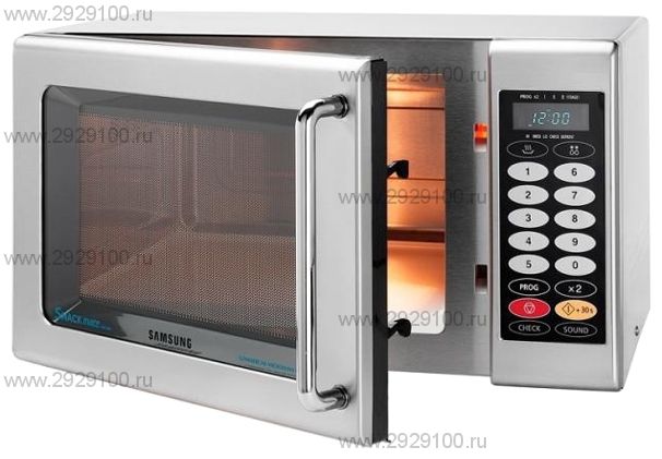 Описание Печь микроволновая SAMSUNG CM1069AСВЧ печь Sumsung CM1069A, предназначена для приготовления блюд различной сложности, разогрева готовых блюд, а также для их разморозки. Данная модель сертифицирована для профессионального применения. Основное отличие от классических печей (духовки или “русской” печи), заключается в том, что нагрев продуктов в СВЧ печи происходит не с поверхности, а по всему объему продукта, что существенно сокращает время приготовления или разогрева продукта. Для приготовления продуктов лучше всего использовать термостойкую стеклянную или керамическую посуду. Объем рабочей камеры данной модели составляет 26 литров. Конструкция печи позволяет использовать ее на различных предприятиях общественного питания, при разных условиях окружающей среды. В качестве системы опор выступают четыре прорезиненные ножки, что позволяет более устойчиво разместить аппарат на кухне. Модель оснащена прозрачной дверцей и внутренней подсветкой, что позволяет контролировать процесс приготовления, не открывая печь. Камера и корпус печи изготовлены из нержавеющей стали, что гарантирует длительный срок службы. Печь оснащена электронной панелью управления с возможностью сохранения до 20 программ. Счетчик циклов производит подсчет количества использований каждой программы. Пять уровней мощности, включая уровень для размораживания, и 3 стадии приготовления позволяют воплотить в жизнь любые кулинарные изыски. Печь оснащена функцией подсчета времени для одновременного приготовления двойного количества порций (x2), а также функцией увеличения времени приготовления (+20 сек). СВЧ печь CM1069A идеально подходит для использования в кафе, небольших ресторанах и в столовых. Характеристики Печь микроволновая SAMSUNG CM1069A