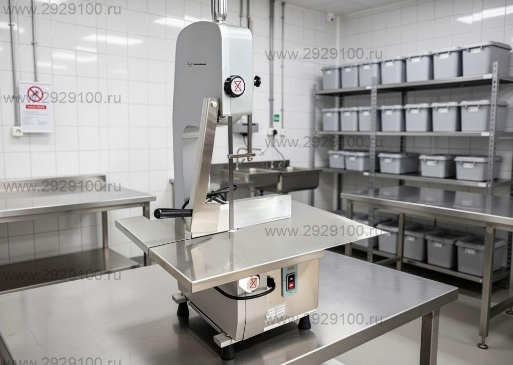 Настольная ленточная пила для резки свежего и замороженного мяса, включая мясо на кости, а также рыбы и птицы.