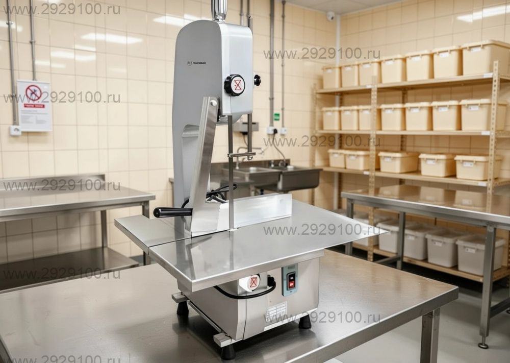 Настольная ленточная пила для резки свежего и замороженного мяса, включая мясо на кости, а также рыбы и птицы.