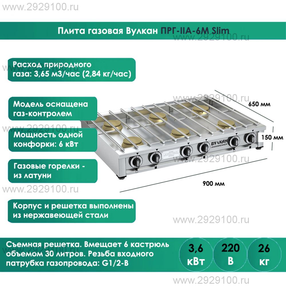 Описание Плита газовая Вулкан ПРГ-IIA-6М SlimГазовая плита Вулкан ПРГ-IIA-6М Slim предназначена для приготовления первых, вторых и третьих блюд в наплитной посуде.