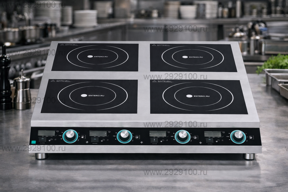 Индукционная плита для приготовления блюд в наплитной посуде с цифровым управлением и четырьмя зонами нагрева.