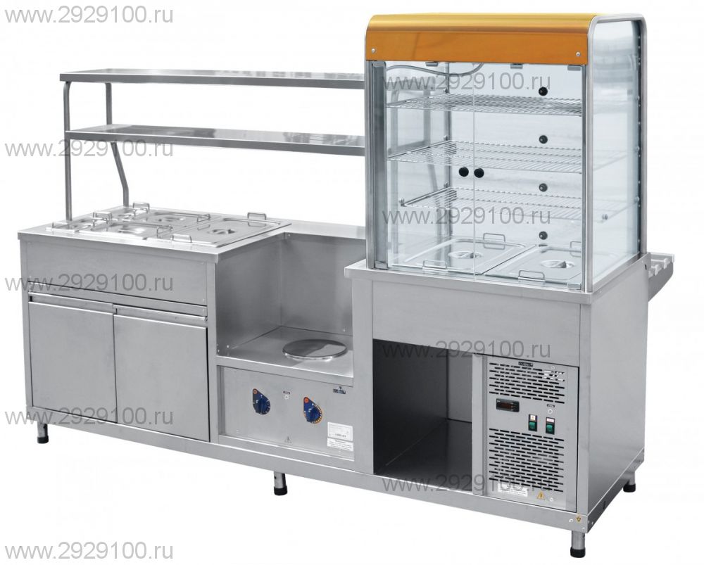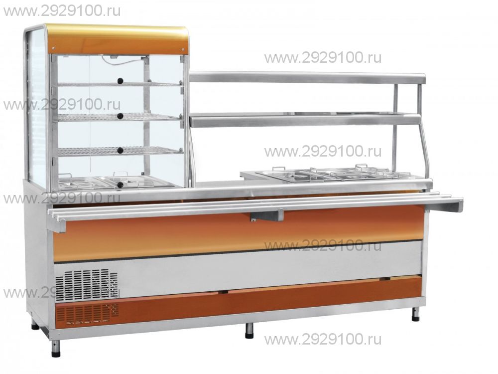Прилавок-витрина холодильный мармитный универсальный ПВХМ -70КМУ нерж. предназначен для кратковременного сохранения: холодных закусок в витрине, а также первых и вторых блюд в гастроёмкостях в горячем состоянии и раздачи их потребителям.
