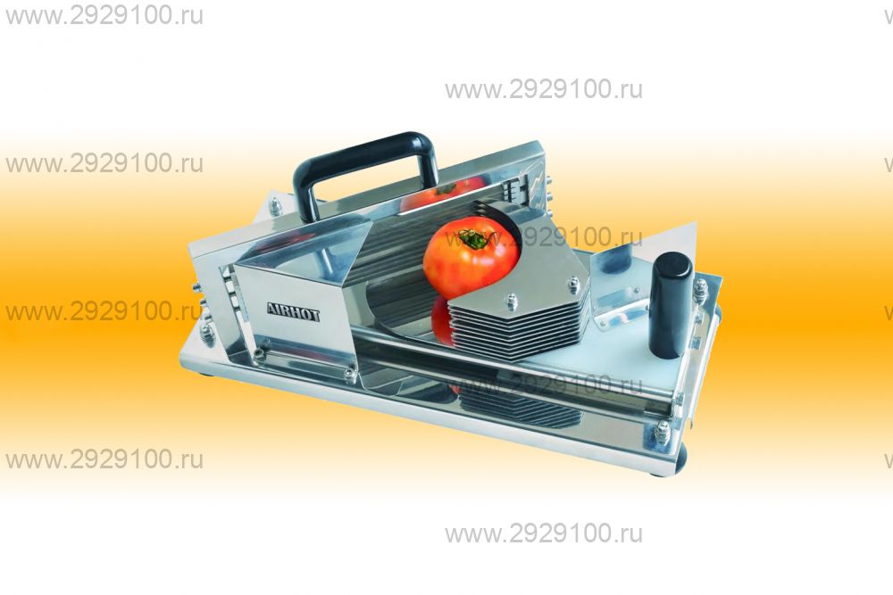 Описание Слайсер для томатов, ручной AirhotРучной слайсер для томатов предназначен для быстрой и равномерной нарезки помидоров на предприятиях общественного питания, в отелях и гостиницах. Обеспечивает одинаковую толщину ломтиков при минимальных трудозатратах оператора. - Тип: ручной слайсер для томатов - Толщина среза: 4,8 мм — фиксированная, для стабильной подачи и сервировки - Количество ножей: 13 — обеспечивает быструю нарезку за один проход - Максимальный диаметр томата: до 80 мм - Материал изготовления: нержавеющая сталь — гигиеничность и износостойкость - Устойчивость: 4 нескользящие резиновые ножки - Назначение: профессиональная кухня, линии сборки, заготовка ингредиентов