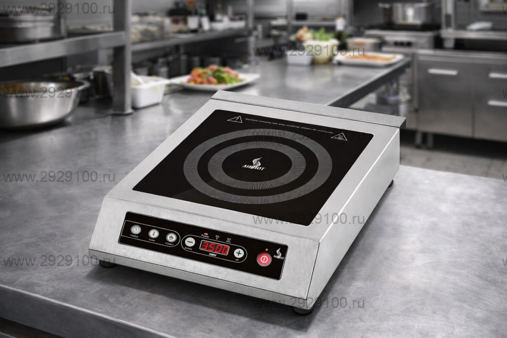 Описание Плита индукционная Airhot IP3500Профессиональная индукционная плита для быстрого и энергоэффективного приготовления блюд на предприятиях общественного питания. Предназначена для точного контроля нагрева при минимальных теплопотерях и повышенной безопасности работы на кухне. - Тип: индукционная плита (одна конфорка) - Мощность: 13 уровней регулировки от 0,5 до 3,5 кВт - Диаметр зоны нагрева: 240 мм - Температурные режимы: 10 предустановок от 60 до 240 °C - Управление: электронное - Таймер: до 3 часов, шаг 5 минут, с автоотключением - Импульсный режим: есть, для деликатного нагрева - Максимальная нагрузка на поверхность: до 30 кг - Безопасность: автоматическое отключение при снятии посуды, защита от перегрева - Охлаждение: 2 вентилятора - Материал корпуса: нержавеющая сталь - Требования к посуде: только ферромагнитная - Назначение: профессиональное приготовление блюд, высокая скорость и точность нагрева