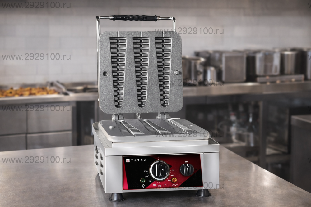 Описание Вафельница Tatra TWI 1 TIAMOРаспродажа Профессиональная вафельница, хорошо подходит для выпечки вафельных рожков при поточной работе и стабильном качестве готового продукта. - Тип: вафельница для вафельных рожков - Количество вафель за цикл: 3 шт. - Форма вафли: рожок (конус) - Размер вафли: 230×60×24 мм - Температурный режим: +50…+300 °C - Рабочие поверхности: чугун с антипригарным (тефлоновым) покрытием - Управление: электромеханическое, терморегулятор - Индикация: нагрева и питания - Оснащение: встроенная ёмкость для сбора излишков теста и жира - Материал корпуса: нержавеющая сталь - Страна производства: Турция Характеристики Вафельница Tatra TWI 1 TIAMO