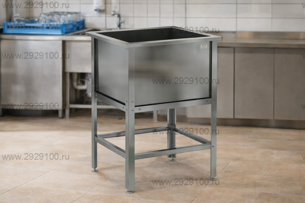 Описание Ванна моечная ВМС/1-53/53 без борта 1 секцияВанна моечная односекционная сварная предназначена для ручной мойки посуды, кухонного инвентаря и пищевого сырья на предприятиях общественного питания и пищевых производствах. Конструкция рассчитана на интенсивную ежедневную эксплуатацию и соответствует санитарным требованиям. - Тип: ванна моечная односекционная, сварная - Назначение: ручная мойка посуды, инвентаря и сырья - Размер моечной ёмкости: 430×430×300 мм - Материал ёмкости: пищевая нержавеющая сталь AISI 430 - Конструкция ёмкости: отогнутая кромка по всему периметру для защиты персонала - Каркас: разборный, из оцинкованных уголков - Усиление конструкции: нижняя обвязка по периметру (4 стороны) для повышения устойчивости - Ножки: регулируемые по высоте - Комплектация: пластиковый сифон - Опция: вырез отверстия под смеситель (дополнительно) Страна производства: Россия Характеристики Ванна моечная ВМС/1-53/53 без борта 1 секция
