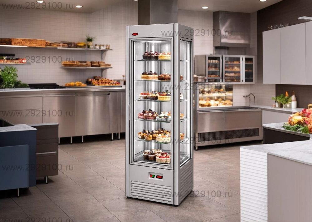 Описание Витрина кондитерская RS-0,4 VENETO вертикальнаяВертикальная кондитерская витрина предназначена для демонстрации и кратковременного хранения тортов и десертов в торговых залах кафе, кондитерских и ресторанов. Вращающиеся полки обеспечивают круговой обзор продукции и усиливают визуальный эффект выкладки. - Тип оборудования: кондитерская витрина вертикальная, вращающаяся - Назначение: демонстрация и хранение тортов и десертов - Температурный режим: от +1 до +10 °C - Тип охлаждения: динамическое - Холодильный агрегат: Danfoss - Количество полок: 5 шт., стеклянные, вращающиеся - Размер одной полки: 535 × 535 мм - Скорость вращения полок: 2,5 об/мин - Площадь выкладки: 1,1 м² - Остекление: полное, по периметру - Подсветка: внутренняя - Назначение по формату: торговый зал, витринная экспозиция десертов Характеристики Витрина кондитерская RS-0,4 VENETO вертикальная