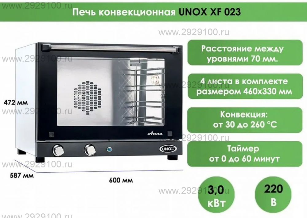 Описание Печь конвекционная Unox Anna XF 023Компактная профессиональная конвекционная печь без пароувлажнения для ежедневной выпечки и приготовления блюд при ограниченном рабочем пространстве. - Количество уровней: 4 - Формат противней: 460×330 мм - Температурный диапазон: до 260 °C - Тип нагрева: конвекция, без пароувлажнения - Функции: удаление избыточной влажности DRY.Plus - Управление: механическое, таймер до 60 мин - Подключение: однофазное, рекомендуется подключить через стабилизатор напряжения Страна производства: Италия